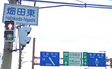 国道171号線を西方向へ進む、「畑田東」の交差点から「大阪 吹田(府道14号線)」や「名神高速 茨木インター」の案内標識が見えるので直進通過して、次の歩道橋の(左)側道に入り、「大阪 吹田(14)」の方向へ進む。「畑田」交差点を道なりに左折、府道14号線を南下する。